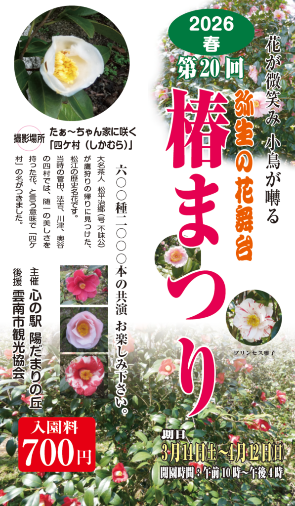 【第20回】椿まつり開催 3/14~4/12 2026.03.11 寒い冬を乗り越え今年も綺麗な椿が咲いてくれました💖心の駅陽だまりの丘には600種2000本もの椿があり自分の好きな椿を見つけるのも楽しいですよ(^^♪ 開催期間:3/14(土)~4/12(日)開園時間:AM10:00~PM16:00入園料:700円 その他お問い合わせは ℡0854-43-8181まで