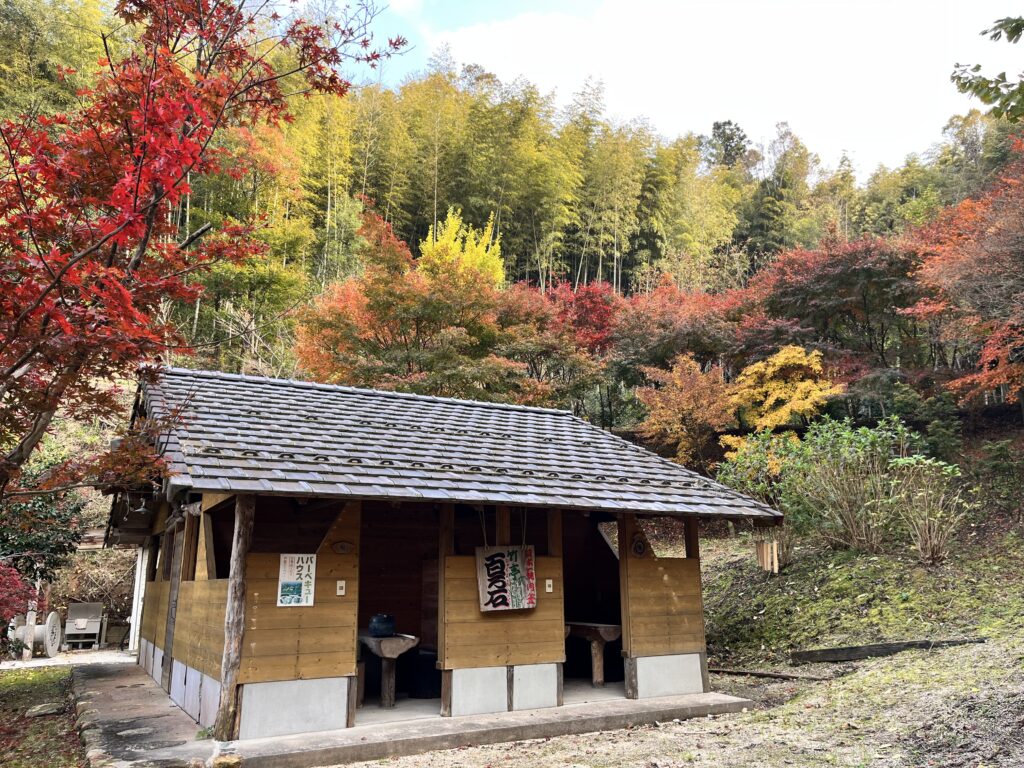 すこやかパーク内、木々の木漏れ日の中に建つ焼肉場です。