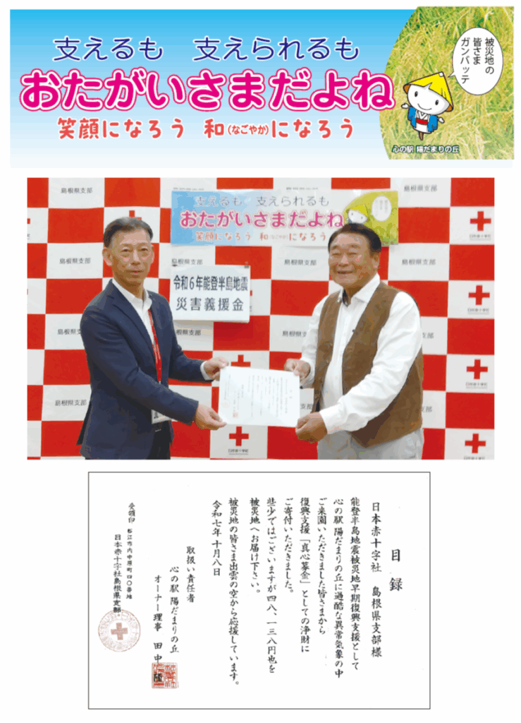 能登半島義援金を寄付しました 2025.10.202025.10.21 令和7年10月8日春は椿まつり、夏はひまわり迷路等の売上金48,128円を能登半島地震復興義援金として日本赤十字社へ寄付しました。 心の駅陽だまりの丘から復興をお祈り申し上げます。